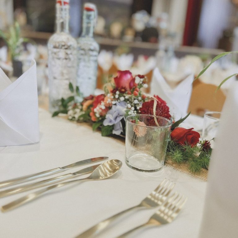 Von Blumenarrangements und stimmungsvoller Dekoration bis hin zu Tischdecken und leuchtenden Kerzen – alles ist möglich, nichts muss. Gestalten Sie Ihr Event ganz nach Ihren Wünschen!